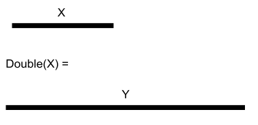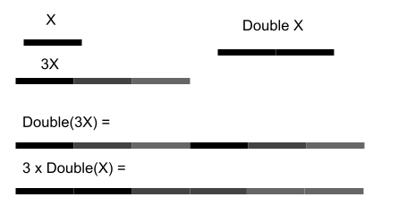 To grasp the second notable property of Double, imagine tripling the length of line X to get a line 3X, and then applying Double to 3X to get a new line Y. This line Y is six times the length of X, or composed of six copies of X. Since three times two equals six, it is equivalent to say that Y is composed of three copies of Double(X). Therefore, Double(3X) = 3 Double(X).