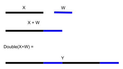 There are two properties of this process Double(X) that are notable. To imagine the first of these properties, imagine that we introduce a new line called W and add it to X in such a way that the length of X + W is equal to the length of X plus the length of W.