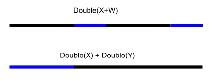 Notice the line Y that is the result of applying Double to X+Y contains two copies of line W and two copies of line X. This means that we can write this resultant line Y not only as Double(X+W) but also as Double(X) + Double (W). So, we can say Double(X+Y) = Double (X) + Double(Y).